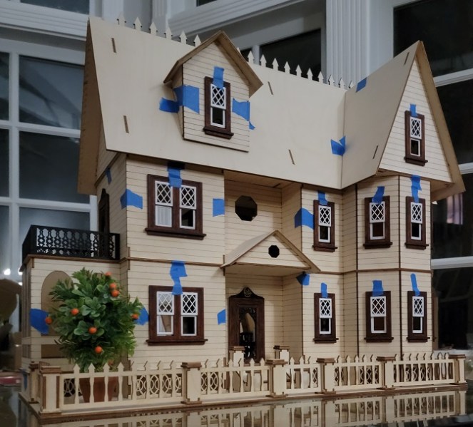 At this scale, the houses are a better size for modern playrooms. This build is a Stephanie Country Mansion from Laser Dollhouses. I have named it “Valentine House” because the kit was a gift from my hubby on the appointed day. (True confession: I ordered the kit and it arrived with perfect timing to let him off the hook. 😉 This might be the secret to a long and happy marriage.